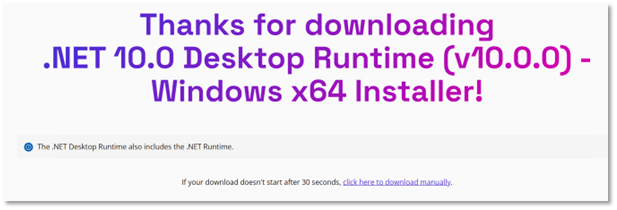Observera att det är Microsoft .NET 10 Desktop x64 som ska installeras.